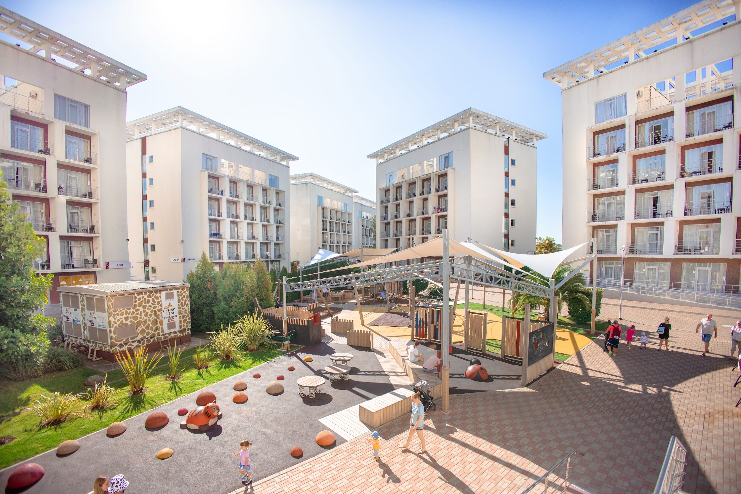 На территории отеля расположены детские площадки из натуральных материалов. Для малышей предусмотрена отдельная зона с мягким покрытием, а также сенсорные островки и балансиры.