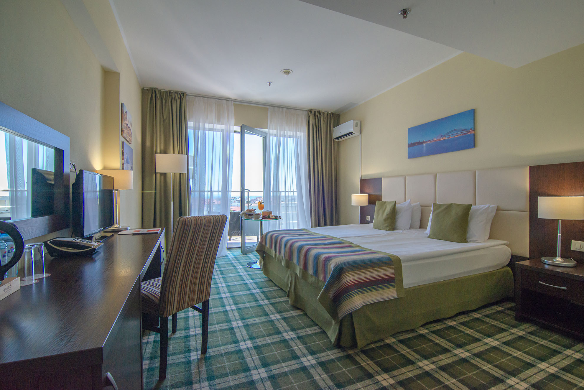 Вас встречает просторный номер, наполненный светом и уютом, расположенный в главном корпусе отеля Bridge Resort. Стены окрашены в нежные пастельные тона, а большие окна ловят каждую лучику солнечного света, наполняя пространство теплом.