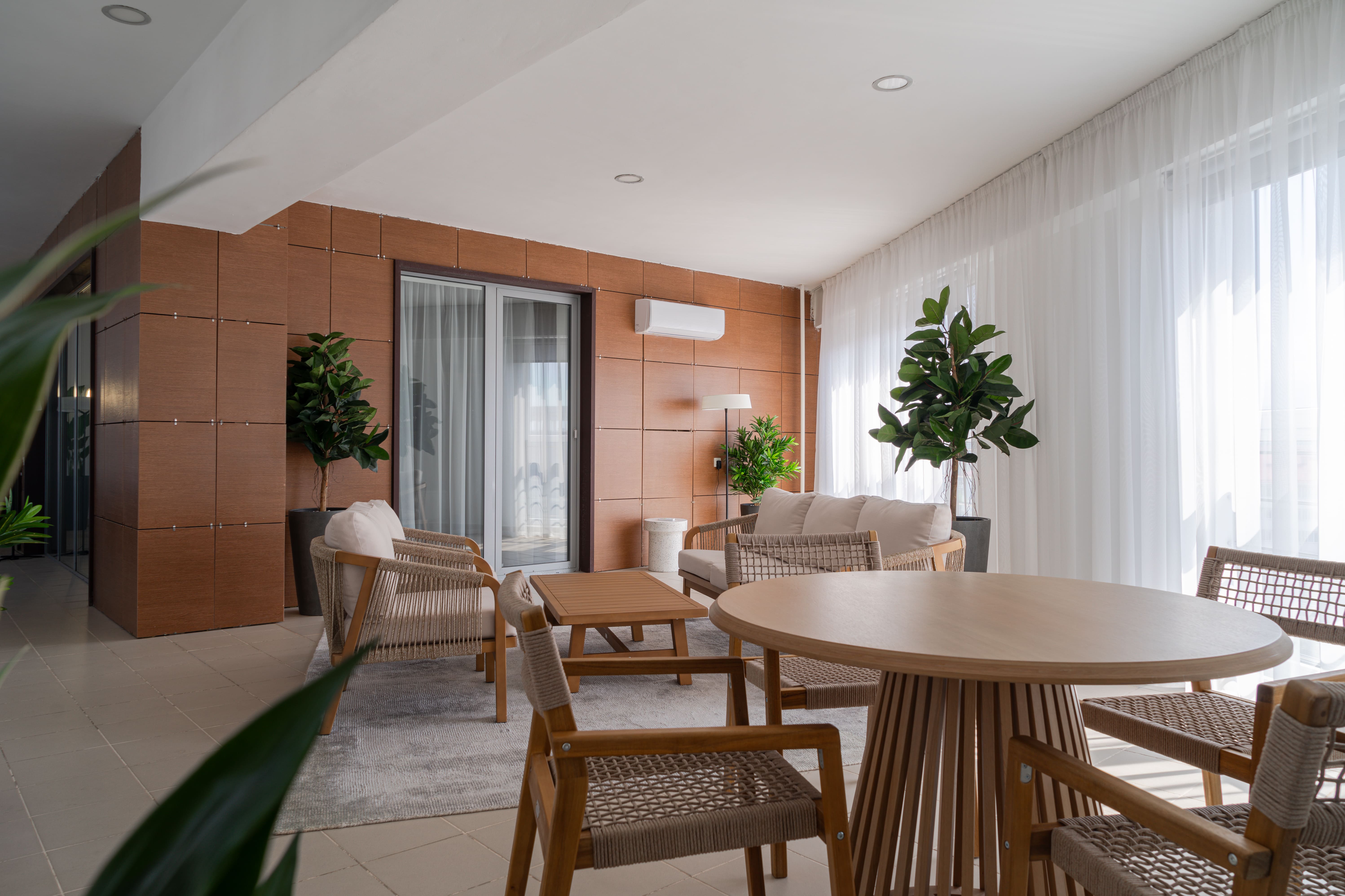 Люкс с террасой отличается современным и стильным дизайном, создающим атмосферу уюта и комфорта. Просторная гостиная, оформленная в нежных тонах, имеет хорошее освещение благодаря большим окнам, пропускающим естественный свет. Мебель из натурального дерева добавляет тепла, а мягкие диваны и кресла обеспечивают удобное место для отдыха.