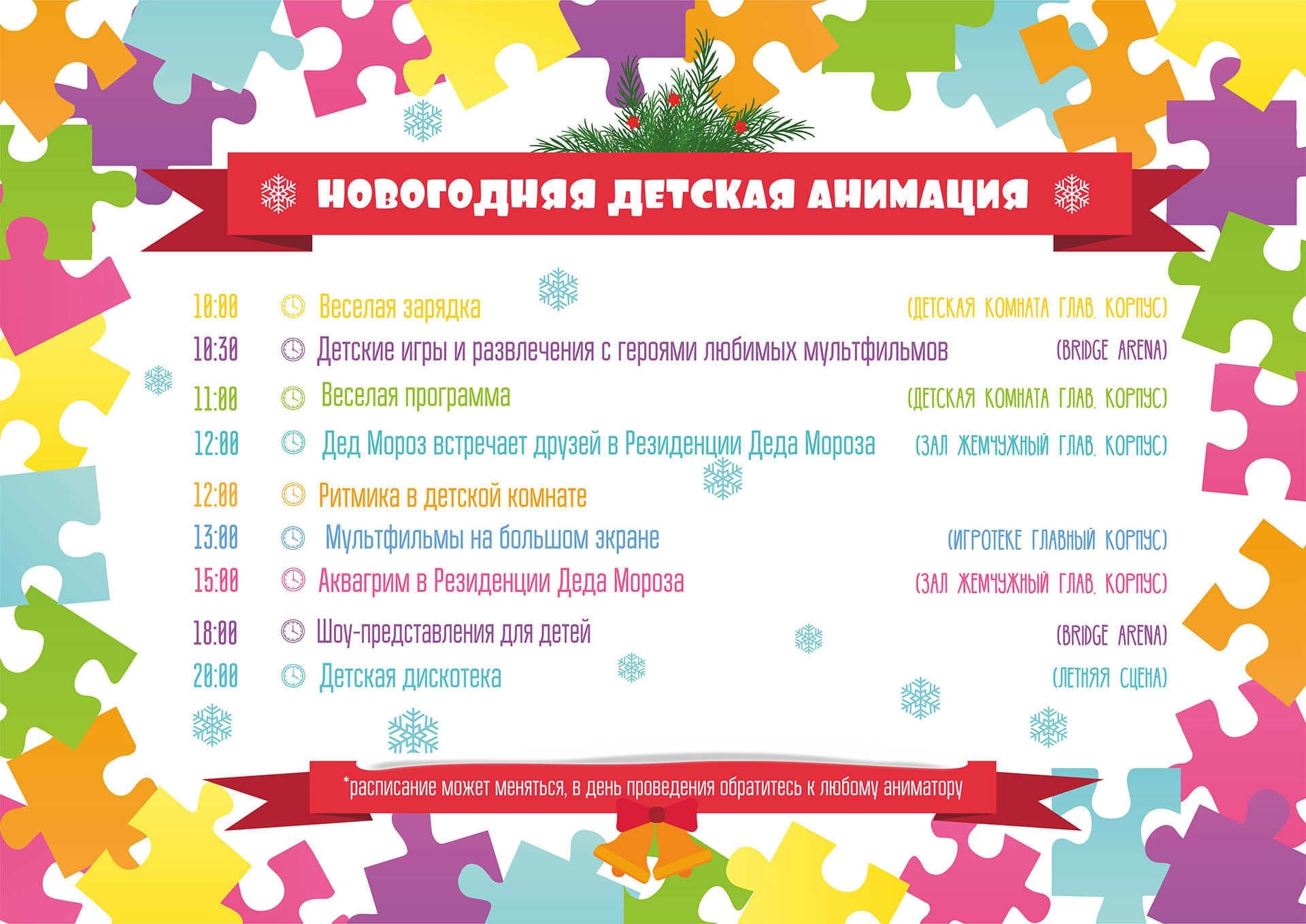 Новогодняя анимационная программа будет проходить ежедневно с 28 декабря по 12 января. С подробным расписанием можно ознакомиться внизу страницы.
