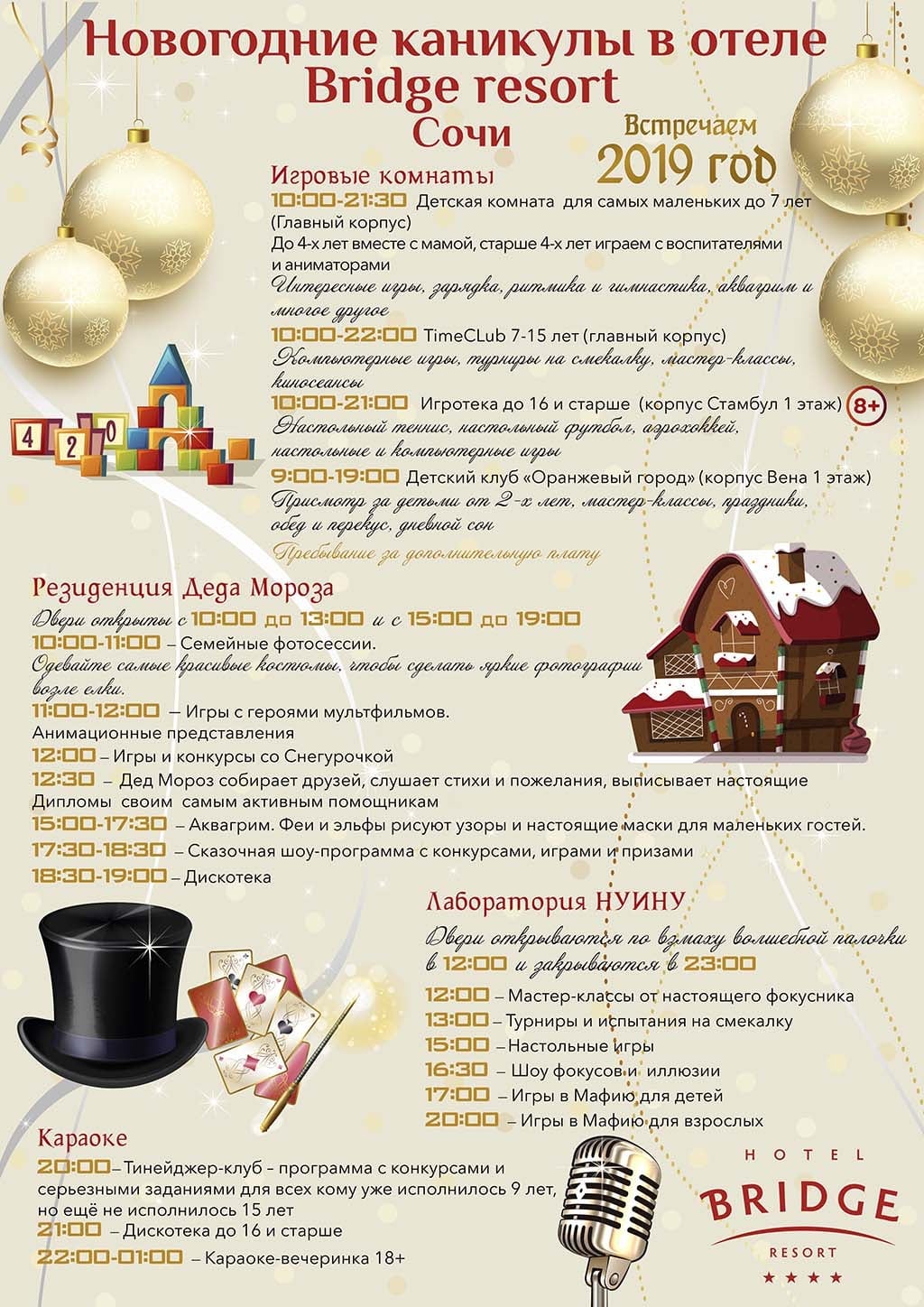 На протяжении всех праздничных каникул гостиничный комплекс Bridge Resort в Сочи погрузится в новогоднюю сказку. Каждый день с 25 декабря 2018 года по 10 января 2019 года будут проходить специальные конкурсы, представления, дискотеки, научные эксперименты и не только!