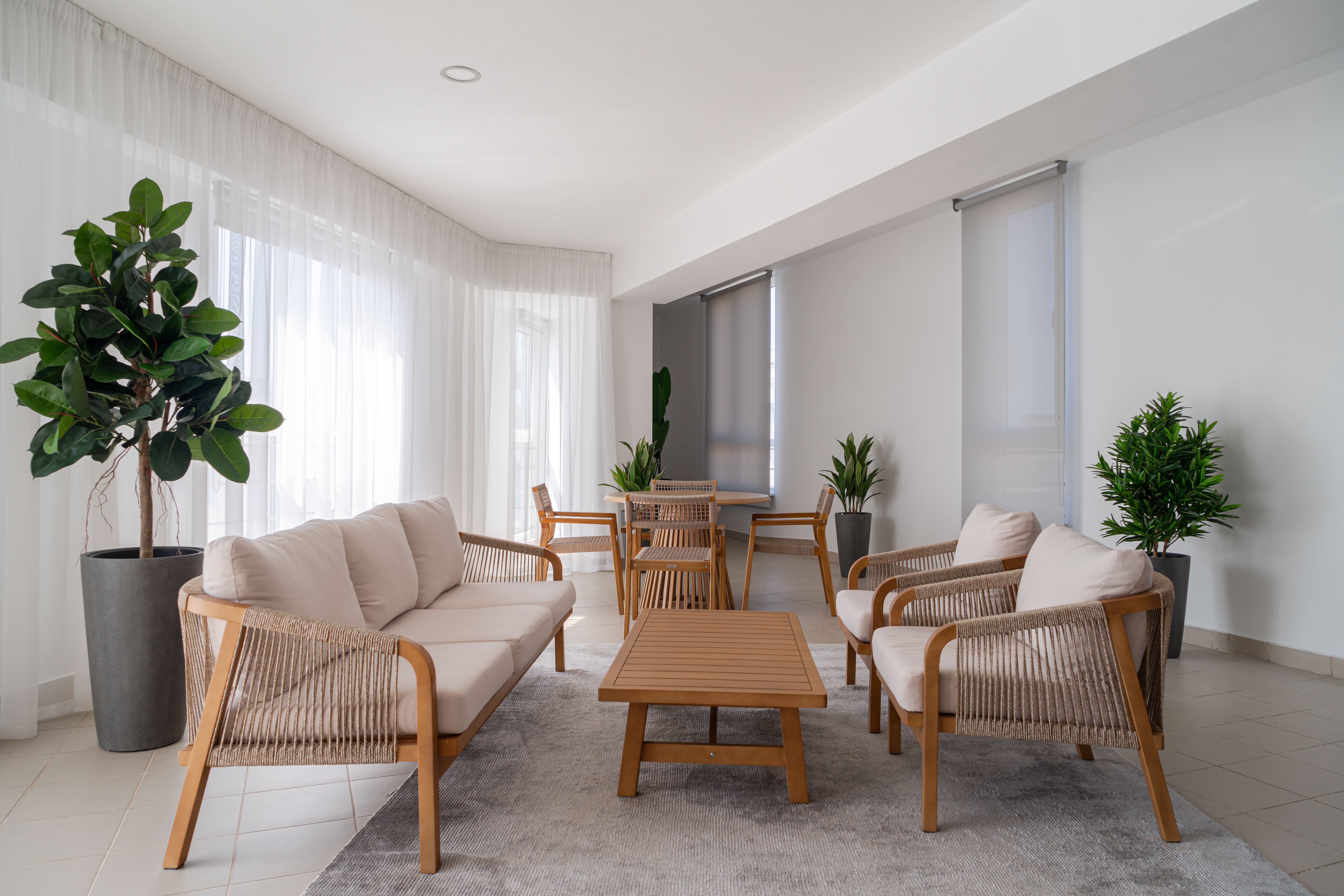 Люкс с террасой отличается современным и стильным дизайном, создающим атмосферу уюта и комфорта. Просторная гостиная, оформленная в нежных тонах, имеет хорошее освещение благодаря большим окнам, пропускающим естественный свет. Мебель из натурального дерева добавляет тепла, а мягкие диваны и кресла обеспечивают удобное место для отдыха.