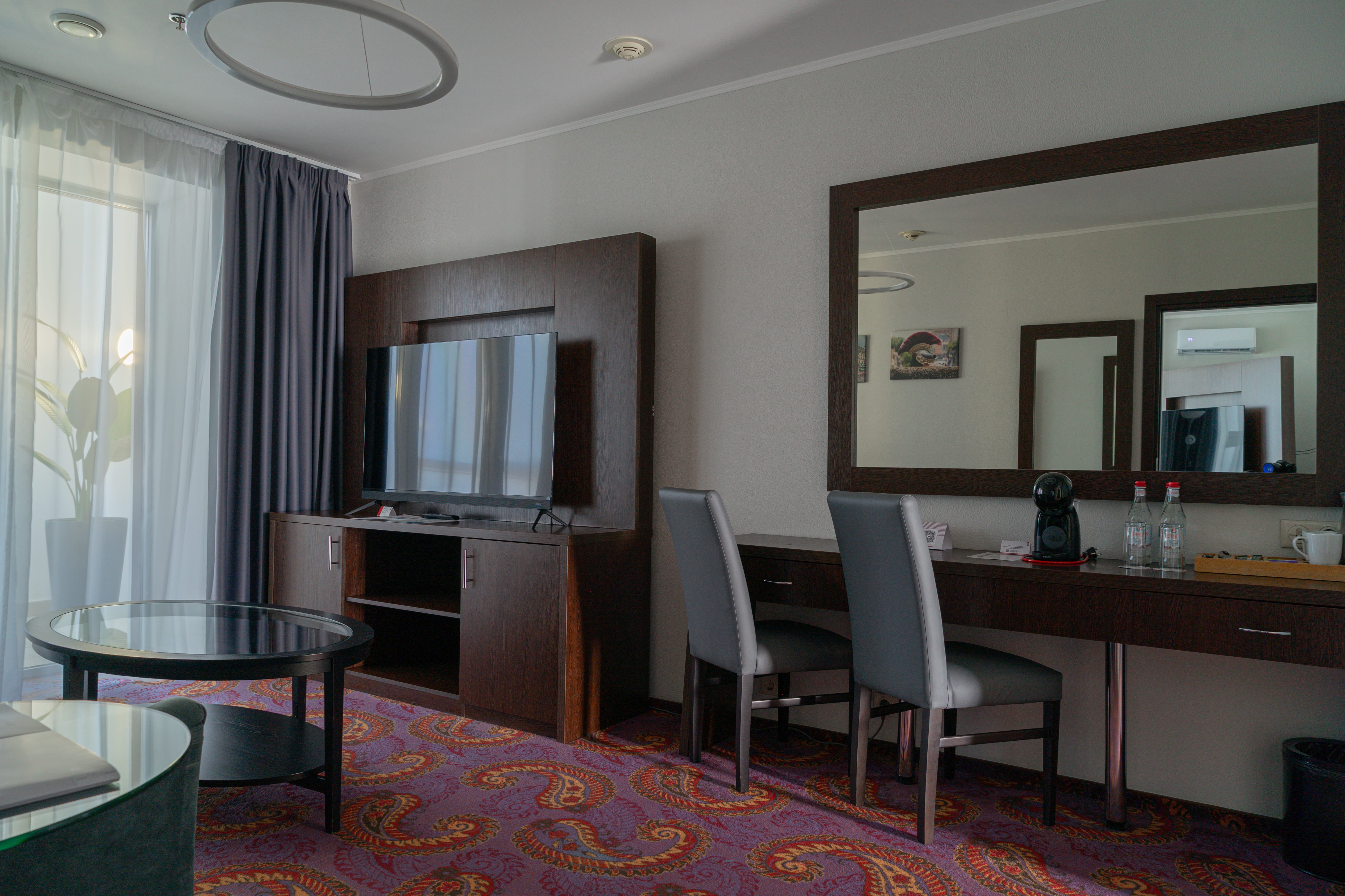 Для гостей, которые нуждаются в рабочем пространстве, предусмотрен отдельный стол с удобным стулом. Здесь можно не только поработать, но и наслаждаться чашечкой кофе, приготовленной с помощью кофемашины. Большой телевизор и зеркальная поверхность в столе добавляют функциональности и стиля.