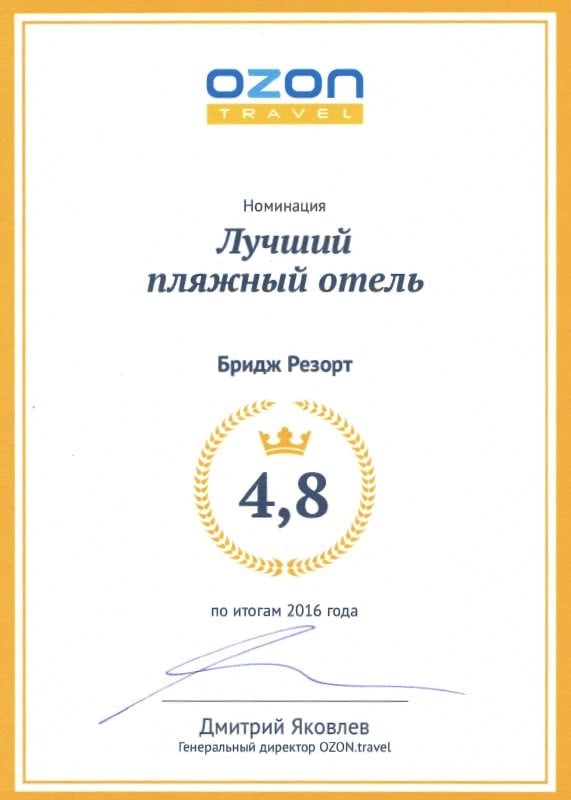 Как сообщает OZON.travel, номинанты отбирались путём статистического анализа оценок и отзывов оставленных тысячами туристов. BRIDGE RESORT 4* стал победителем в номинации «Лучший пляжный отель», набрав 4,8 баллов из 5 возможных.