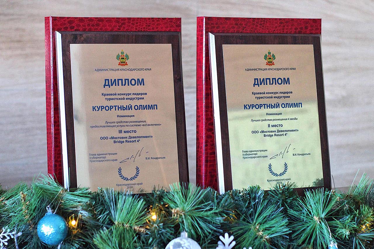 ГК Bridge Resort в Сочи ежегодно становится призером различных конкурсов: Tripadvisor Travellers Choice, TopHotels, OZON.travel. Теперь в копилке новые дипломы престижного конкурса «Курортный Олимп».