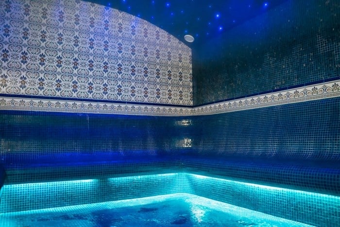 В хаммаме микроклимат наоборот — влажность доходит до 80 %, а температура держится на уровне 40–55 градусов. Плюс здесь установлены специальные раковины, где можно смешивать воду оптимальной температуры для омовения. Это создает особенно комфортную атмосферу, которую дополняет традиционный восточный колорит в отделке. На Востоке турецкую баню всегда считали источником райского наслаждения, поэтому и убранство было роскошным. Потолок-полусфера, натуральный камень на стенах, уникальная мозаика — все под стать царским дворцам. В современном хаммаме в отеле сохранена эта особенность.